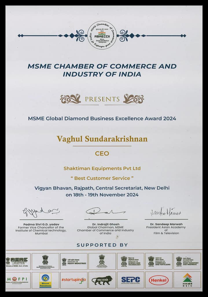 We are delighted to share that our esteemed CEO, Mr. Vaghul Sundarakrishnan, has been recognized with the Best Customer Service award by the MSME Chamber of Commerce and Industry of India. This honor reflects his unwavering commitment to delivering exceptional customer service and his leadership in ensuring Shaktiman Equipments Pvt Ltd stands out in the industry. We thank our team, clients, and partners for their continued trust and support as we strive to provide the best in customer satisfaction.